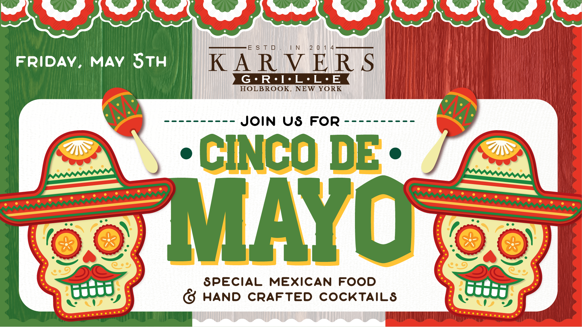 Celebrate Cinco De Mayo with us! Come enjoy hand crafted cocktails and special Mexican food at Karvers!